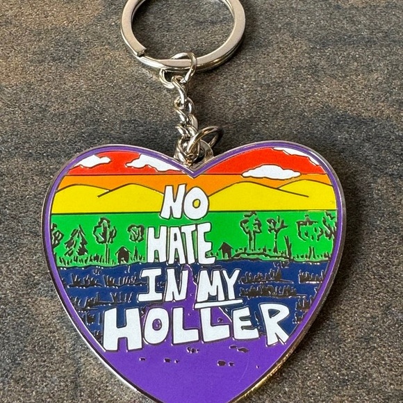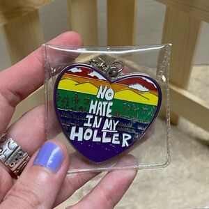 Heart-shaped keychain with vibrant colors and 'No Hate In My Holler' text.