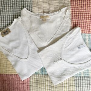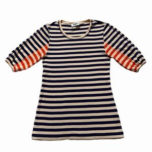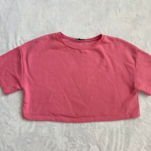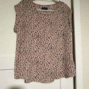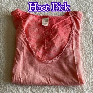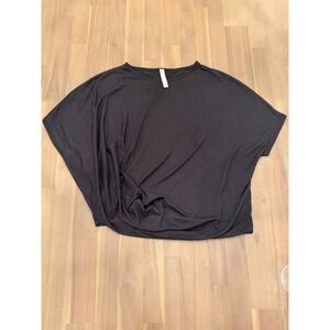Very soft tee 65% polyester 55% rayon. Ties at hem has round neck and pit to pit is 19” and length is 24”