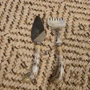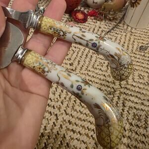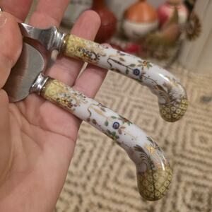 This serving fork is made with a porcelain handle and stainless steel tines, originating from Sheffield, England. The combination of high-quality materials and British craftsmanship makes it a durable and elegant piece for your kitchen or dining table. The addition of the porcelain handle adds a touch of sophistication to the traditional fork design, making it a stylish and practical addition to any collection of flatware.