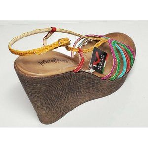 Platform sandals with multicolor leather strappy design. Operational buckle at ankle for a custom fit. Wedge heel for comfort and padded insole. Texturized bottom of shoe.