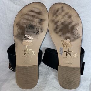 Faux leather thick black ankle strap with gold buckle, zebra print faux calf hair toe strap, flat soles. Size 36, excellent condition.