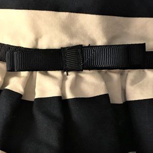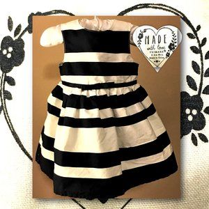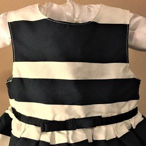 Crisp dark navy stripe on this 100% cotton dress lined in comfy poly. Crinoline petticoat keeps the skirt full and fluffy. Classic grosgrain attached ribbon feature at waist, three button close in back. Imagine this with a cute red bow in her hair for the summer picnics! So cute and classic!