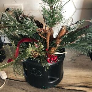 PRIMITIVE HANDMADE SNOWMAN LAMP ARRANGEMENT IN PLASTIC FOLGERS COFFEE CAN