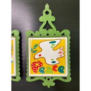 PRINCE TRIVET TILES - Set of 2 Vintage 70s Trivets Cast Iron Ceramic - Peace Joy