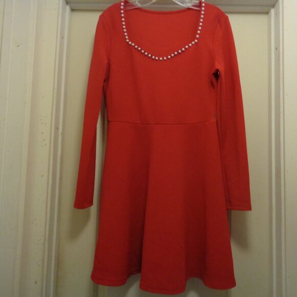 PRINCESS BRIGHT RED KNIT GIRL FLOUNCE PEARLY DRESS 10. WE DO NOT KNOW WHO MADE IT. IT SEEMS TO BE A SYNTHETIC KNIT. IT IS WELL MADE. IT IS DARLING. FROM UNDERARM TO UNDERARM ALL THE WAY AROUND THE PIECE IS 38 INCHES. ALL THE WAY AROUND THE WAIST LINE IS 30 T0 31 INCHES. IT IS A PULL ON. WITH LIGHT WEAR YET PLENTY TO SHARE WITH YOU LUCKY BUYER. ENJOY PRETTY DRESSING. 4TH GROUP. # 489. ALSO EB. THANKS IT IS MORE RED IN PERSON.