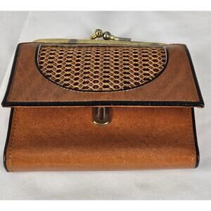 Features: Metal clasp coin pouch, curved flap, woven design, interior card slots