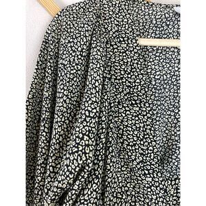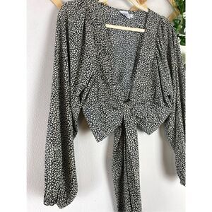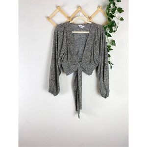 This black and white top has a small leopard print, long puff balloon sleeves, and a tie at the front that can be tied multiple ways. Crop top.