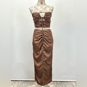 Brown strapless ruched cutout top and matching ruched maxi skirt from PRINCESS POLLY, size 6.