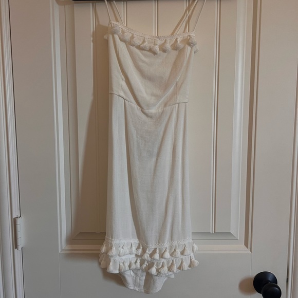 Adorable mini dress with 2 ties in the back and lined with poms! Worn once.