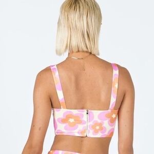 Corset top. Slim fitting. 92% reclaimed polyester 8% elastane. Floral print. Fixed shoulder straps. Boning through front. Pointed hem. Zip fastening at back. Good stretch. Fully lined. Created with high quality reclaimed polyester, this piece is made with materials that have been recovered from consumer use. Size 4. Like new condition