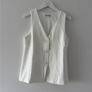 • Vest has front button closure; V-neck