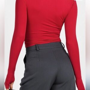 This fitted long sleeve tee from Princess Polly features a rich red hue and a sleek, streamlined design. Crafted from a ribbed knit material, it offers a comfortable stretch and a smooth texture, making it an ideal choice for layering or wearing on its own. Soft. Trusted seller.
