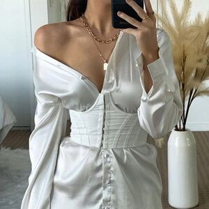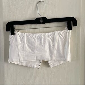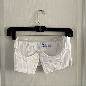 Corset top. 100% cotton. Wired cups. Cut out bust. Hook & eye fastening. Boning down sides. Fully lined. Size 2. A couple small red dots shown in last photo