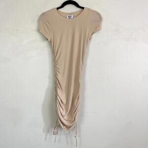 PRINCESS POLLY tan short sleeve ribbed ruched mini dress