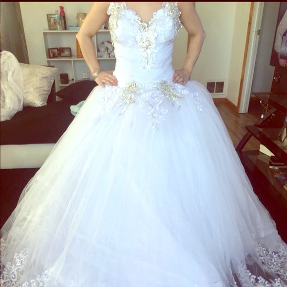 Gorgeous wedding dress. Originally customized in Jordan, but gained weight and couldn’t fit into it. It has never been worn. Just tried on for pictures. The zipper in the back is broken, but is easily fixed. If your worried about sizing you can remove the zipper and you can turn it into a corset. I paid a lot of money for this dress. But it’s time to let it go! I am accepting all reasonable offers!!!