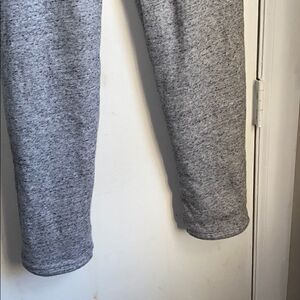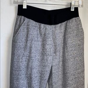 Polyester cotton blend grey joggers with double lining, a cotton lining and a polyester soft plush fleece lining. Slip pocket at each hip, black elastic waistband. Washable. Size XXS, measures