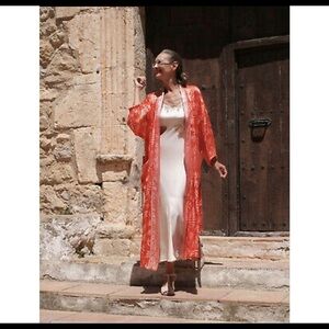 Open front kimono with below-the-elbow length sleeves with elastic cuffs. Front patch pockets. Tied self belt. Side slits at hem.