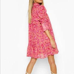 PRINTED PUFF SLEEVE RUFFLE NECK SMOCK DRESS