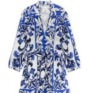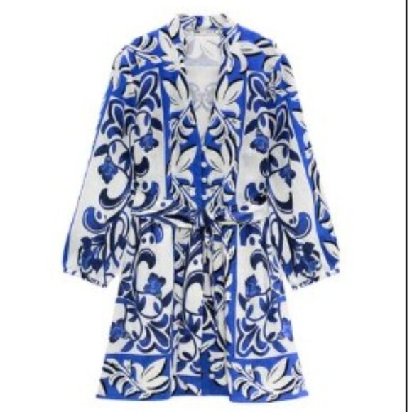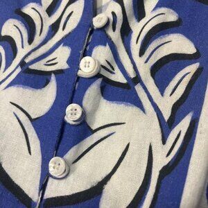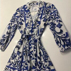 Blue and white printed shirt dress with a flattering V-neck collar and full button front.