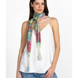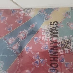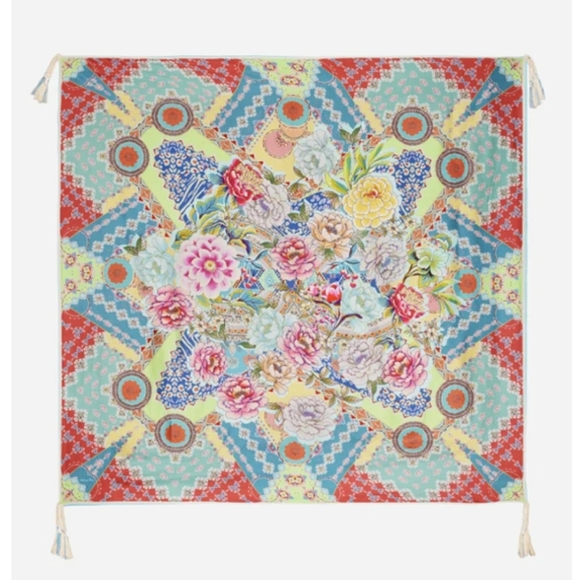 100% Silk • Tassels • Measurements: 44"x44" • Care instructions: Turn inside out. Hand wash gently. Lay flat to dry. Light steam iron if necessary
