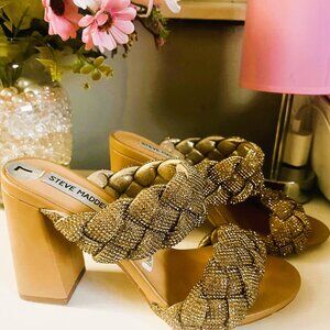 Add a touch of luxe to your look with these stunning Steve Madden block heels in a rich champagne bronze tone. Double braided straps are covered in golden rhinestones that shimmer in every light โ perfect for weddings, girlsโ night, bachelorette parties, or vacations. These were only used ONCE (as you can see by the few scuffs on the bottom) and are in perfect condition. CHECK THE LAST PICTURE TO SEE HOW THEY SHINE!!! THESE ARE GORGEOUS GUYS!!!