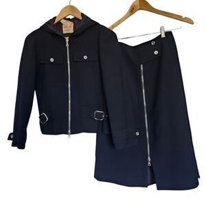 Ultra-rare 1970s Courrèges matching set featuring a structured zip-up jacket with hood, front flap pockets, and belted waist details, paired with a sculptural A-line skirt with asymmetric zipper detail.