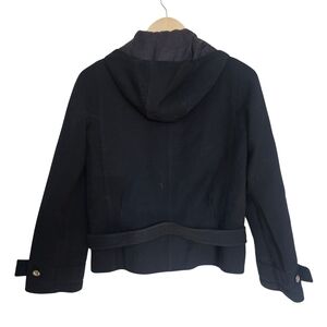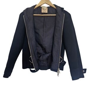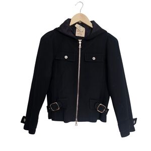 Features: Zippers, silver-tone snaps, utility-style details, hood