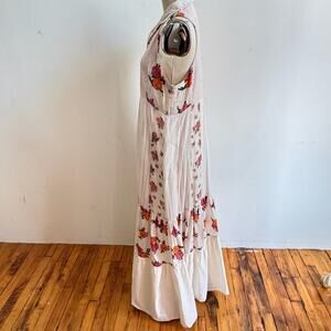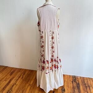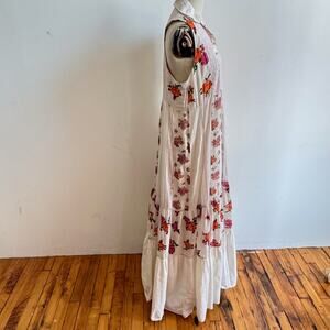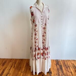 Details: boho floral collared sleeveless maxi dress from designer Péro with buttons down the front to the waist. This, feminine, romantic, cottagecore dress has en embroidered bodice, and tiered skirt in a patchwork of multiple fabrics. Fully lined. Made in India.