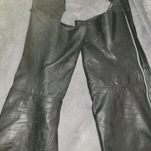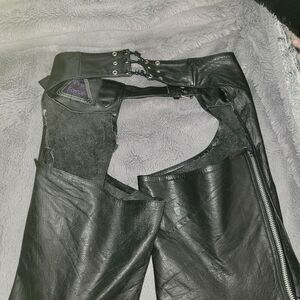 The Pro Force Leather Chaps in Black are designed for adventure motorcycle riding, featuring a belted closure with leg snaps for a secure fit. Made from genuine leather, these chaps are in size 3XL and have a straight leg style. They include an adjustable belt for a customized fit and a hip pocket for storage. Suitable for both men and women, these chaps are ideal for riding in the summer and all seasons, offering both style and protection on the road. Please note the lace for the back of the belt is missing, currently has wire ties, these can be cut and replaced with a new lace or wear them as they come. See pictures for condition and details. Feel free to ask any questions or request measurements.
