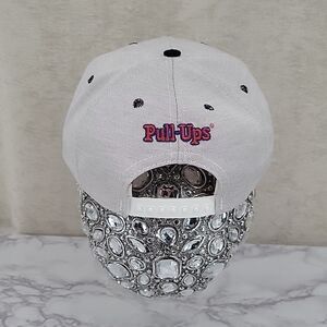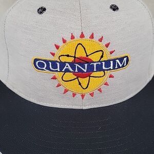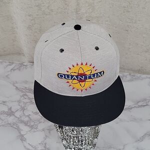 Light gray with flat black Bill, black stiching on air holes. White snap closure. "Quantum" over a Sun on front, "Pull-Ups" on back. Made in Fort Worth Texas, USA No flaws or wear. However, there is a white mark on inner band.