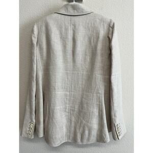 IN VERY GOOD CONDITION, see all pictures for details. 100% Linen & 100% cotton lining, patch pockets, One Button Blazer in Beige/Oatmeal Color. Classic, timeless piece, contemporary