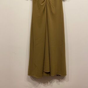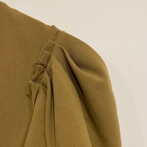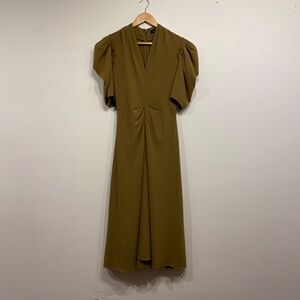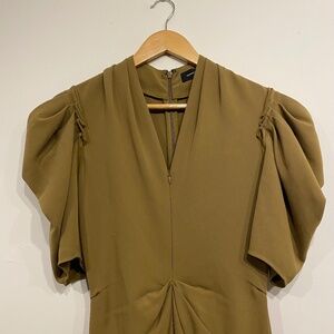 Puff-sleeves draped midi dress in olive green. Crepe texture with a V-neck, short puff sleeves, draped detailing and concealed front zip fastening. A-line skirt and straight hem. Perfect for a special occasion or a fall wedding! There is a very minor pull, shown in the close up photo. Elegant, chic and sophisticated. Size 0. In great condition.