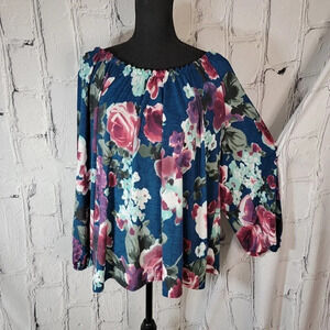 PROFESSIONAL Business Casual Floral Blue Aqua Stretch Long Sleeve Blouse Sz L