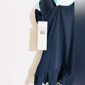 This Elegant Black swimsuit with light blue trim. Features a chic skirted design. Great for poolside, the beach or the lake