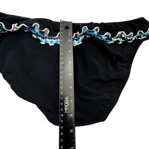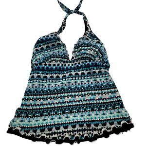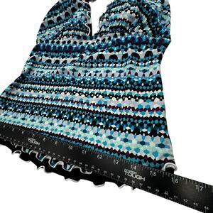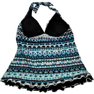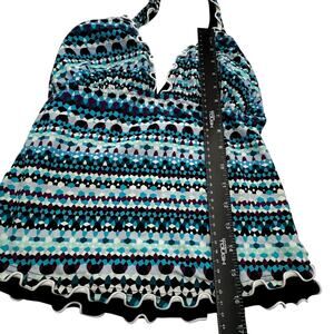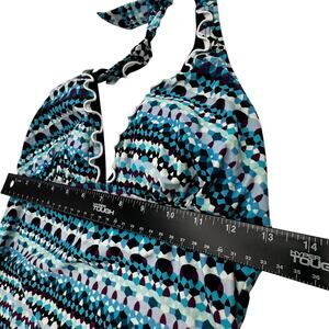 Dive into summer with the chic PROFILE BY GOTTEX Women's 10 Blue Bachata V Neck Halter 2 Piece Tankini. The ensemble includes a flattering halter swim top and a matching bikini bottom, both adorned with a vibrant, geometric pattern that captures the essence of a sun-soaked getaway. The blue hues are complemented by playful ruffles and bows, adding a touch of whimsy to your beach or poolside attire. Crafted from a blend of nylon, polyester, and spandex, this swimsuit offers both comfort and durability. Designed with a built-in bra and tummy control, it provides a seamless silhouette and ensures a snug fit. The tankini's adjustable straps and convertible style offer versatility, while its lined interior ensures a smooth touch against your skin. Perfect for any aquatic adventure, this swimwear set exudes a playful yet sophisticated charm.