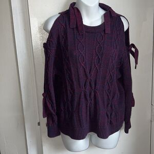 Washable cotton acrylic blend in a Marled navy and maroon cable knit with cold shoulder detail and ties down the sleeves. Excellent condition. Size small, measures 23” from armpit to armpit and 23” from top of shoulder to bottom hem.