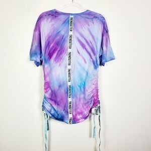 Short sleeve, ruched side detail, tie dyed, trendsetter ribbon, raw edge v-neck tee.