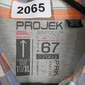 Pre-Owned Condition! 100% Cotton. Freestyle Orange, White, Blue Button Down Plaid Shirt with Black LOGO Buttons(spare attached).