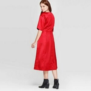 * PROLOGUE BOAT NECK SATIN SHORT SLEEVE MIDI DRESS RED