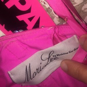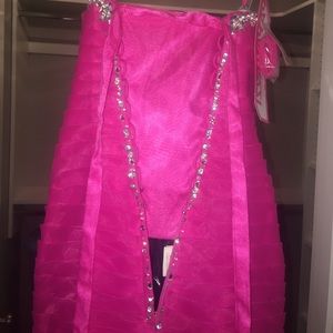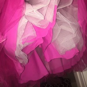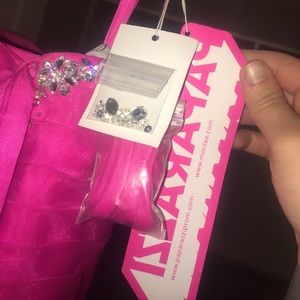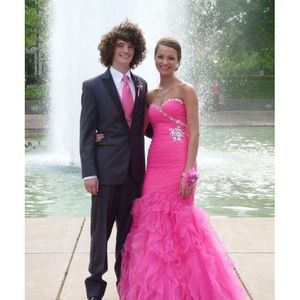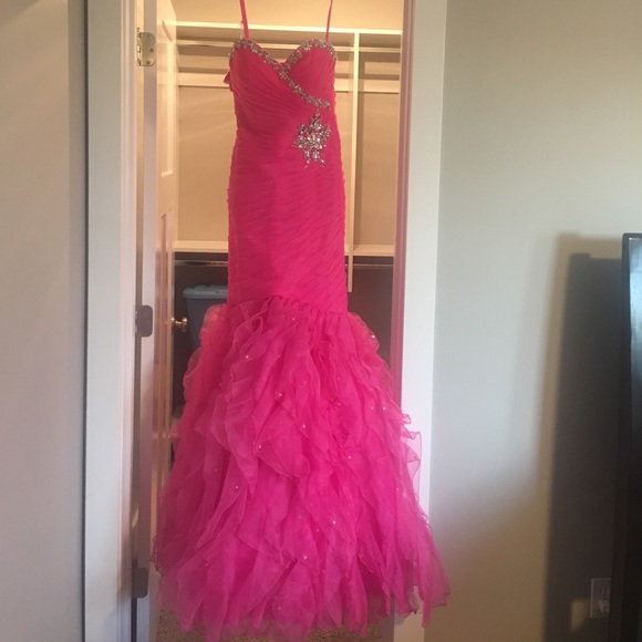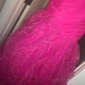 This elegant and high quality Moro Lee mermaid style prom dress has only been worn once. It is complete with Swarovski crystal bead work. There is a bustle in the back & Corset tying for the best looking fit. The bottom is slightly dirty from walking, but it is not visible to the eye unless looking under dress. It is able to be dry cleaned and is 100% polyester shell and lining.