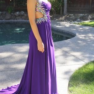 one shoulder, open back! beautiful purple color! only worn once with sewn in boob pads. perfect condition!