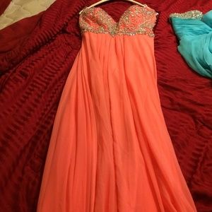 It is a BEAUTIFUL prom dress only wore for 2 hours. I got countless compliments! It's a coral color! Tight at the upper waist and flowy from the waist down! Has gorgeous rhinestone on top have of the dress easily hemmed if needed. Very flattering for all sizes! Hate to sell it but I'm bout to buy a wedding dress and I would hate for such a wonderful dress to sit in my closet for te rest of my life!