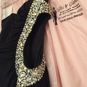 Long black prom dress with stones going around the shoulder strap and opening on the side. Worn once for a few hours.
