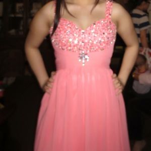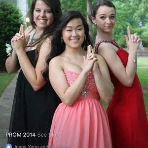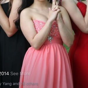 This is my prom dress only worn once. It's coral/baby pink. It has straps but for the pictures I just tucked them in that day. The straps are the same color as the dress but it's bidazzled like the chest area.