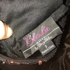 Black with rose gold sequin prom dress! Open back with back zipper, fitted then flared right below butt. Great condition! Worn once!! Length in front from top of shoulder:5ft 3 in Length in back from top of shoulder: 5ft 10 in bust: fits sizes around 32-34 a, b, or c
