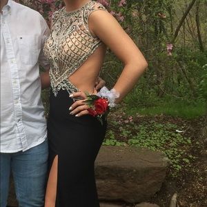 selling xs black prom dress I wore it last year, it’s in excellent condition. There’s a slit and an open back it’s super pretty if you have any questions just ask!!!