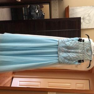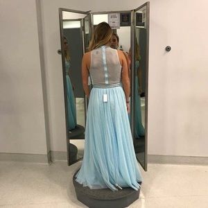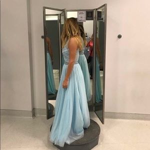 Baby blue two-piece floor length prom dress. Only worn once. Very comfortable. Halter top.