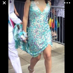Teal/blue prom dress. With iridescent sequins that reflect purple/rose gold/ pink colors. Size 4. Wore once. Message to throw an offer.