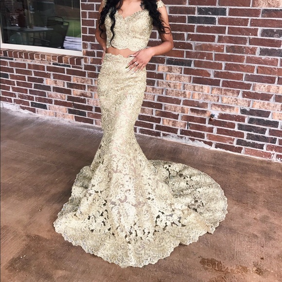 Gold with reflective diamonds on dress, fitted two piece (I also have matching earrings if interested in those) WORN ONCE!! Great condition!!