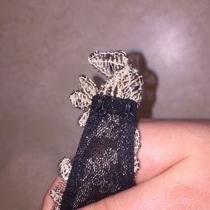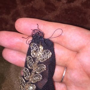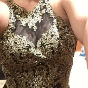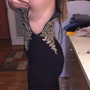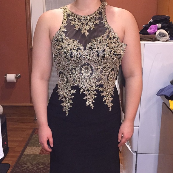 Black and gold prom dress. Side, front and back views. I cannot get it zipped but there’s a zipper on the side. There are a couple dirty spots from tracking through mud but if I get a buyer I will clean it. The clasps on last 2 pictures are a little frayed but work okay. Fit to show curves.
